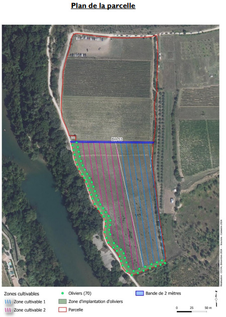 Surface : 1 ha. Ancienne friche agricole remise en été début 2025, dont 35 arbres ont été transplantés en 2025 et 171 olivettes plantés à l’automne 2024 sur des variétés ( Amellau, Picholine, Lucques, Clermontaise, Aglandou, Bouteillan, Neigrette, Oliviere)